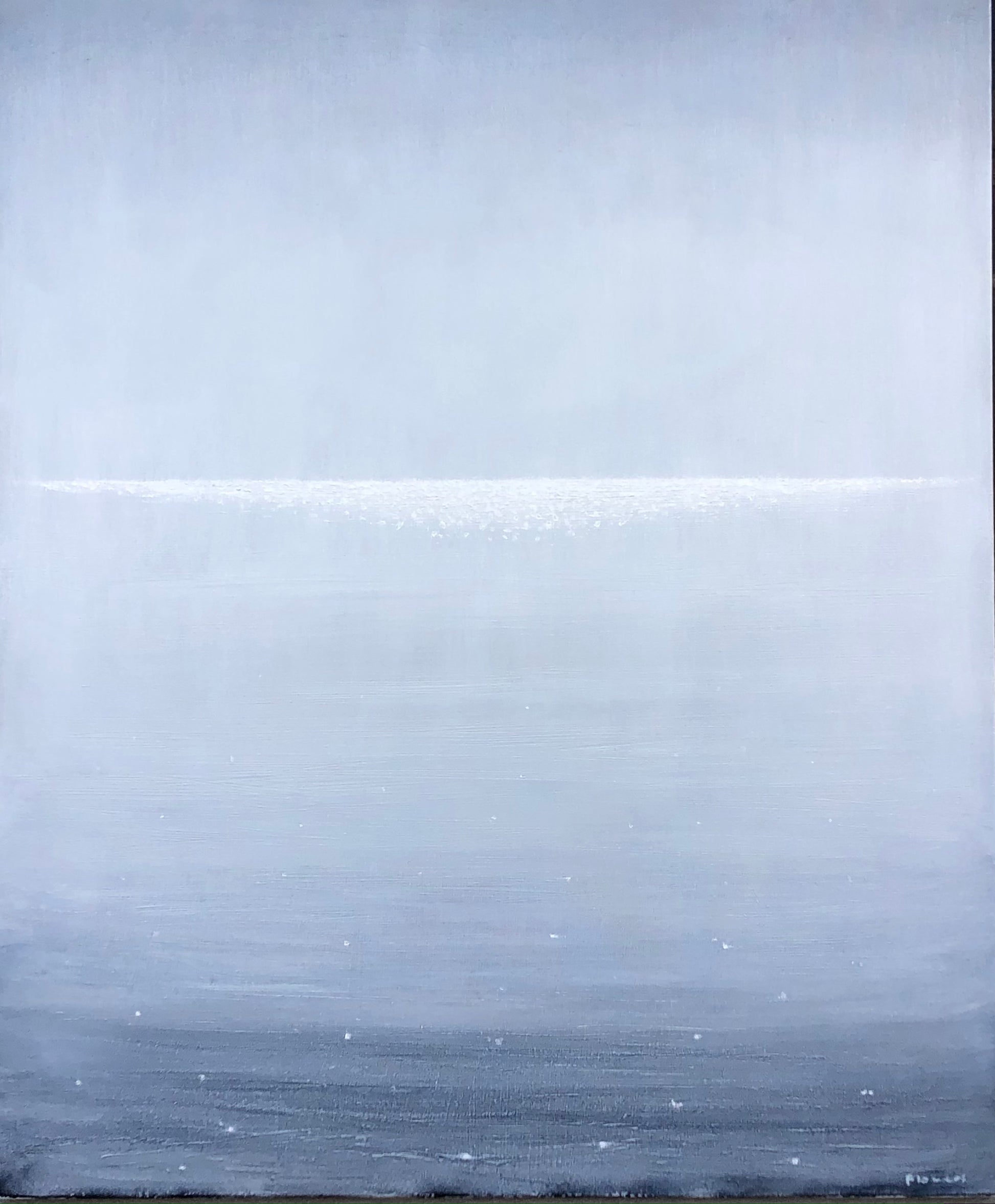 For some years I lived on The Esplanade at Indented Head. Gradually the ‘sea and sky’ expansive views across Port Phillip inspired my work to become obsessed with capturing sea sparkles on water in various atmospheric conditions – this painting is one of a recent series.